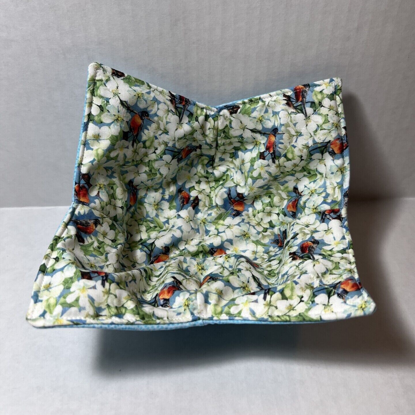 Use this colorful Apple Blossoms and Robin Microwave Bowl Holder to keep fingers from getting burned when taking items out of the microwave! The reversible microwave bowl cozy is a fun and functional way for keeping hot food hot and cold food cold. The Apple Blossoms Robin design reverses to a light blue.