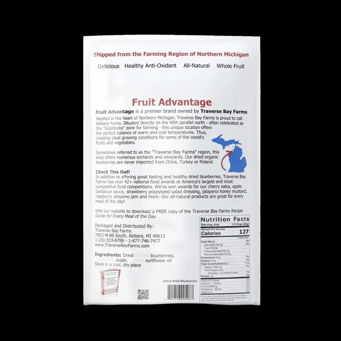 Dried Wild Blueberries are always delicious in baked goods, on ice cream or as a snack right out of the bag. But did you know blueberries are packed with antioxidant properties? The Dried Wild Blueberries not only taste great, they’re good for your body in many different ways! The domestic wild blueberries are grown on the Western side of the State of Michigan along the coastline of Lake Michigan.