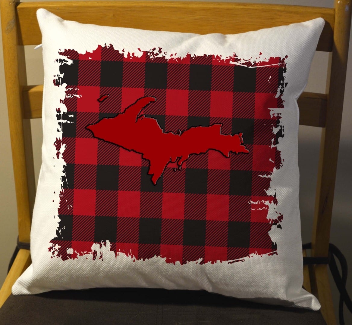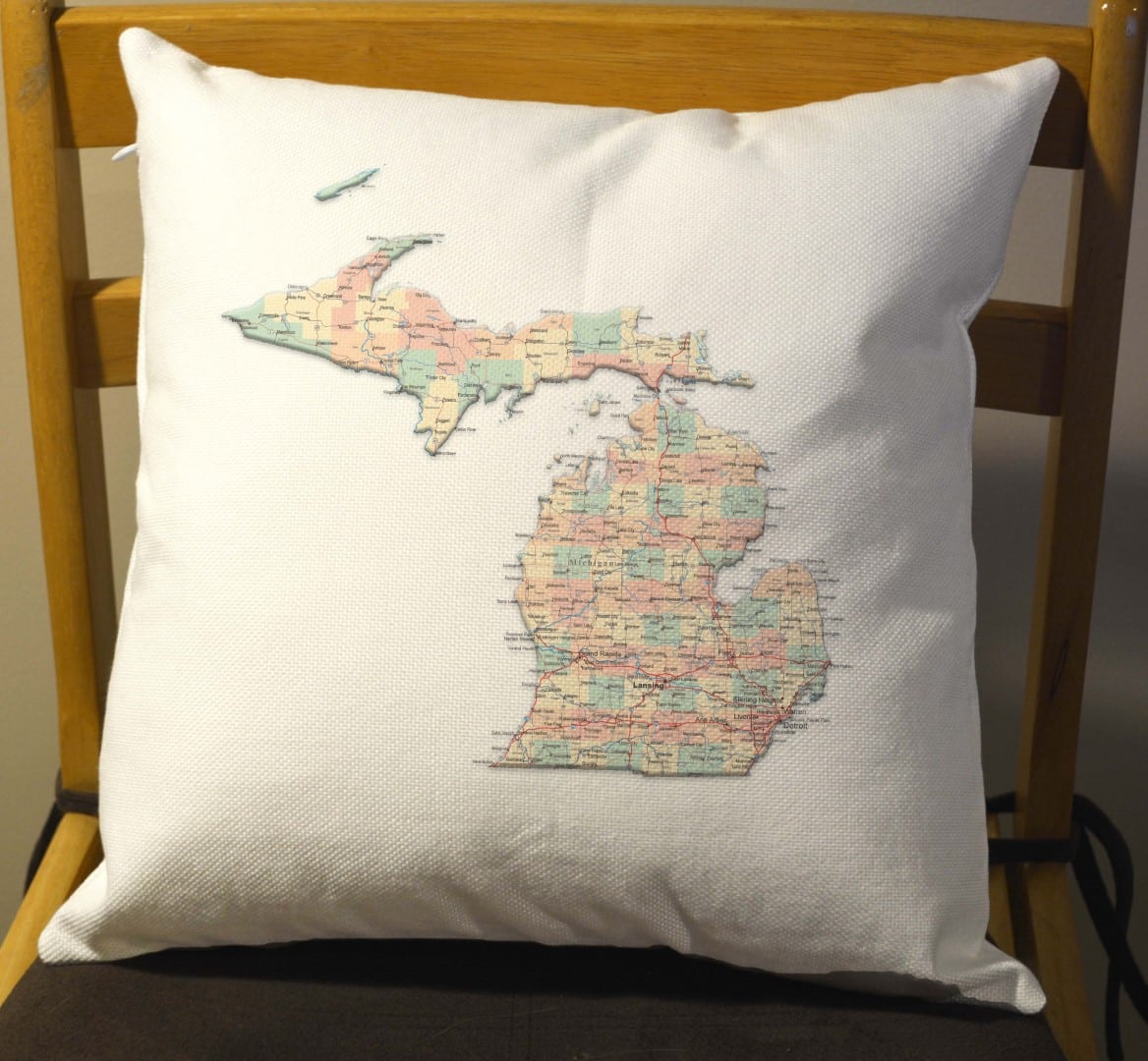 The Michigan Decorative Pillows feature colorful MICHIGAN, colorful Michigan map, and buffalo check Upper Peninsula designs. The image is fired directly into the fabric and will not change how it feels. The textured poly-cotton linen pillow sham reverses to a solid off-white back with a pocket envelope flap closure. The reverse side of the pillow sham may be personalized with your text*.
