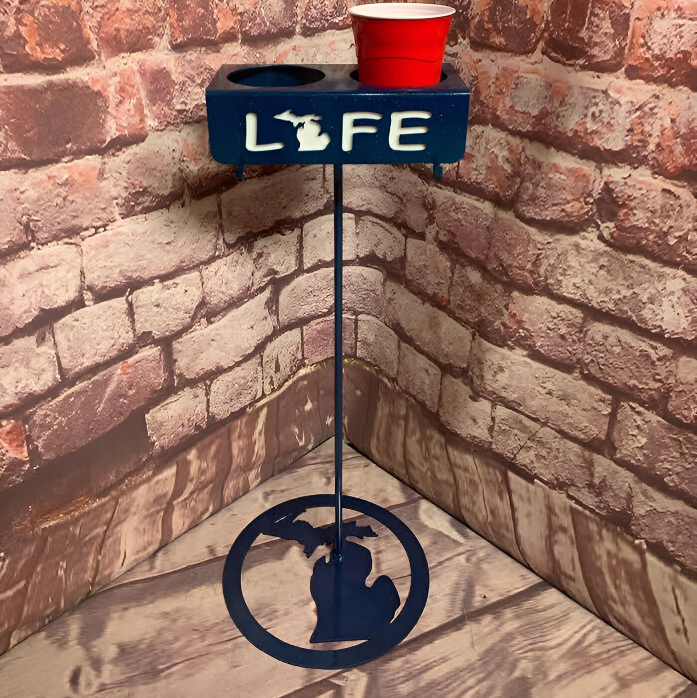 This Michigan LIFE Beverage Holder is a portable, fun and functional Beerstix for inside and outdoors. The Michigan map patio base adds even more personality. Made of heavy gauge metal for stability and measures 27” tall. The Ground style has a stair step rod and measures 27” tall with a 6” stake. Total height is 33”.