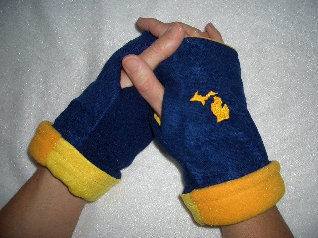 These Michigan Reversible Fingerless Gloves are fashionable and FUNctional! Perfect for those chilly University of Michigan football games or a Michigan fan. Show your Michigan team spirit with this pair of 4 in 1 Reversible Gloves: 1-Solid blue fingerless glove with Michigan emblem reverses to solid maize side. 2-Find the hidden mitten between the layers for warm-up mitten. 3-Join fingerless gloves together to create a muffler. 4-Push fingerless glove down for wrist/arm warmer and clap for your team!