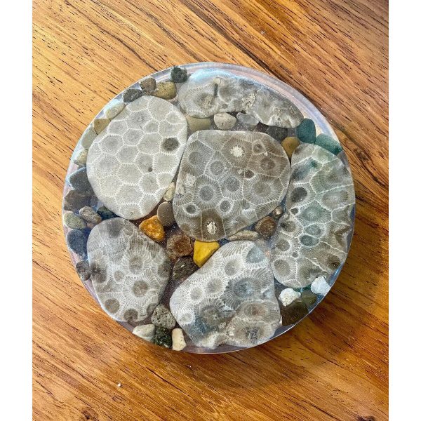 Each Petoskey Stone Coaster features several Petoskey Stones surrounded by a variety of smaller stones set in epoxy. The coaster has a cork back and measures 4 inches in diameter with a height of 5/8 inch.